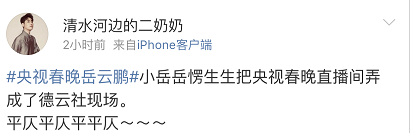 首个出场的语言类节目是岳云鹏和孙越合作的《妙言趣语》,两人将传统的猜字谜、作对联等春节年俗通过作品一一呈现,既展现了传统文化又抖了包袱。而岳云鹏和现场观众也互动热烈,有网友调侃,“看到春晚的观众也在‘平仄平仄平平仄,仄平仄平仄仄平’,还以为在看(德云社)专场呢!”