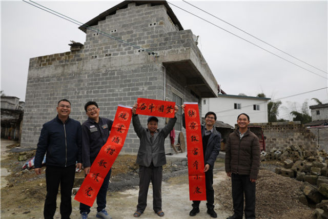 在广西上林县云桃村,“70后”扶贫村干部黄周瑜(左一)、南方电网南宁供电局驻村扶贫第一书记黄建敏(左二)等与脱贫户(中)一起准备贴春联(1月17日摄)。新华社记者 何丰伦 摄