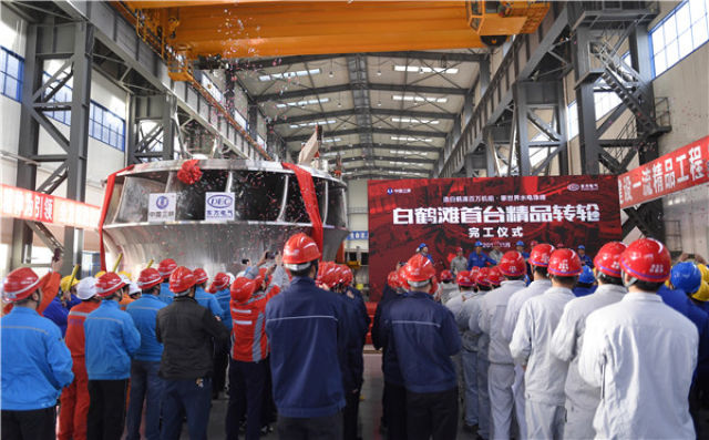 这是白鹤滩水电站首台百万千瓦水轮发电机组的转轮完工仪式现场(1月12日摄)。新华社记者 刘坤 摄