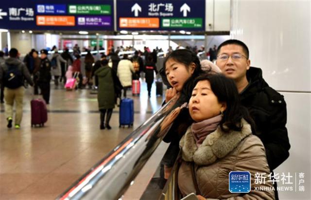 ↑李冰(前)与丈夫和女儿在北京西站等待父母的到来(2月3日摄)。本组图片均由新华社发(任超 摄)