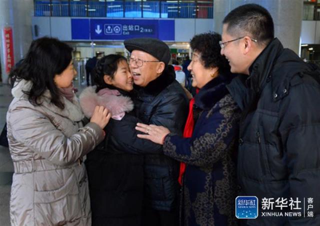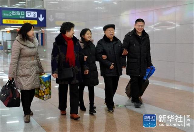 ↑李冰(左一)一家三口在北京西站接到孩子姥姥、姥爷(2月3日摄)。