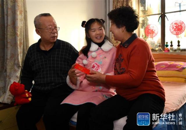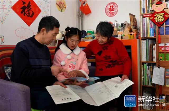↑李冰的女儿吴景涵(中)在给爷爷、奶奶展示期末考试成绩(2月4日摄)。