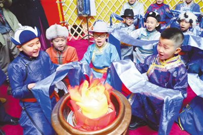 孩子们体验蒙古族小年祭火仪式。