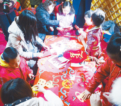 家长与孩子一起制作蒙古族福帖。内蒙古博物院供图