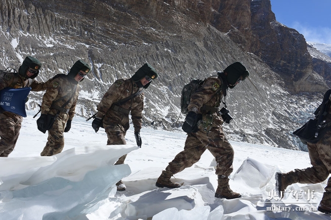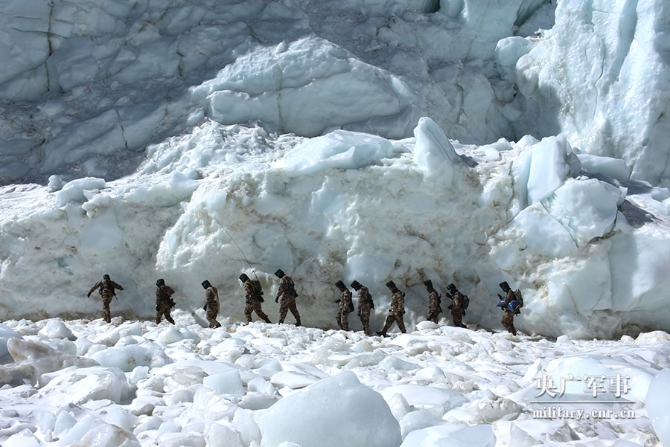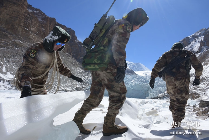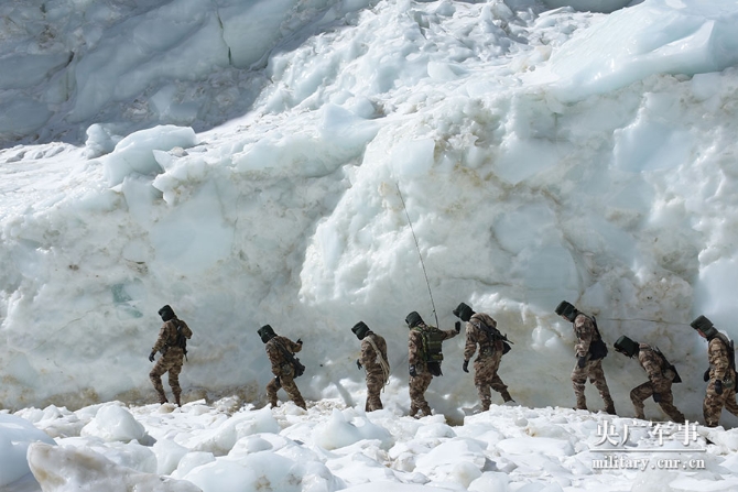 目标就在眼前,是亘古冰川,刀插不进,鹰飞不过。 鸟不敢来,哨兵常在。张宇对这个冰川再熟悉不过了,数度与之交手。只见他简单勘察地形,迅速牵绳上前,招呼队员跟上。笔者排在垫后的下士卫生员崔元博前面,咬紧牙关跟上。