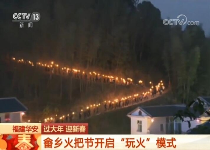 在福建华安县高安镇坪水村,到处张灯结彩,一片喜庆氛围。畲乡火把节吸引了八方来客,慕名而来的游客和村民陆续点燃手中的火把,排起长队穿梭在山上,宛如一条百米长龙,远处望去流光溢彩、美不胜收。队伍所经过的人家,烟花礼炮齐放,璀璨夺目。大家欢聚在美丽的村寨,观看畲族传统歌舞,共度新春佳节。