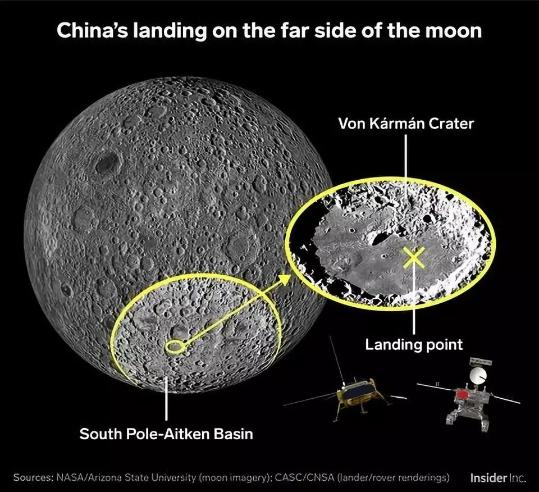 嫦娥四号探测器降落在一个直径185公里,被称为冯?卡曼陨石坑的撞击坑内。它是南极-艾特肯盆地的一部分:该盆地直径约2500千米,形成于39亿年前的一次碰撞。这次撞击可能将月球的深层地质层溅到了月球表面,这使得它成为一个特别有价值的研究领域。