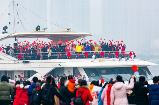 在歌曲高潮部分,十架动力伞从远空滑翔而来,挂上鲜艳的五星红旗。同时,一艘载客近千人的大游轮开足马力,驶向洲头。此时,船上、岸上、天上——“海陆空”三处遥相呼应,引爆全场激情,万人挥舞国旗,高声同唱《我和我的祖国》,给祖国送上新春祝福。