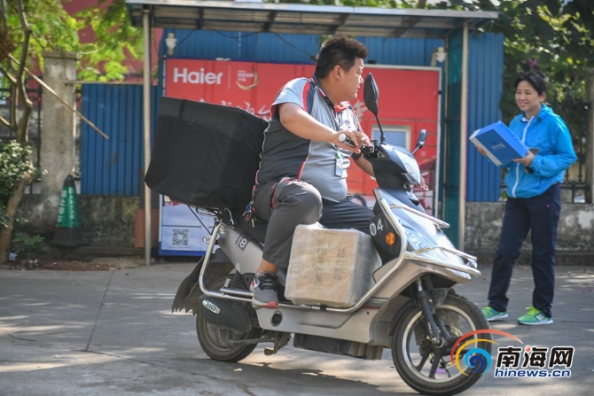 2019年2月8日,海口市金星路,快递员给顾客送物品。海报全媒体中心记者 袁琛 摄