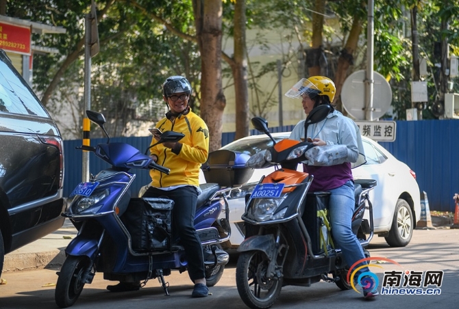 2019年2月8日,海口市龙华区南海大道,两位快递员休息空隙中互相打招呼。海报全媒体中心记者 袁琛 摄