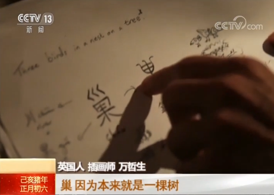英国插画师 万哲生:你看,举例说,巢,因为本来就是一棵树,一个“木”字,上面像鸟巢,有三个小鸟。
