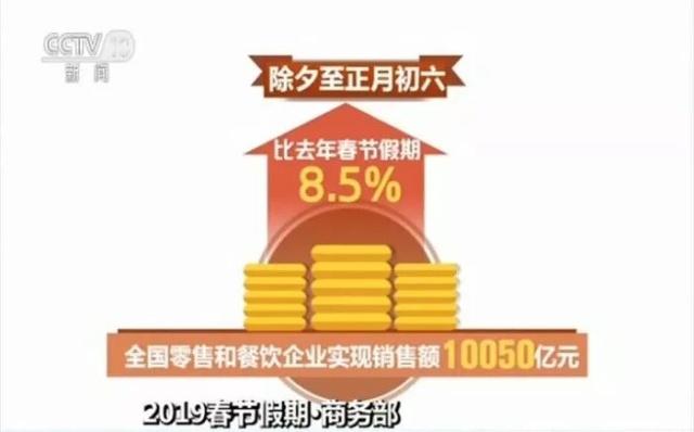 商务部10日发布的数据显示,2019年春节黄金周期间,全国商品市场保持平稳较快增长。除夕至正月初六(2月4日至10日),全国零售和餐饮企业实现销售额约10050亿元,比去年春节黄金周增长8.5%。