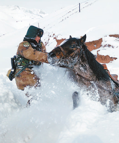 新疆克孜勒苏军分区玉其塔什巡逻小分队官兵蹚着齐腰深的大雪巡逻。刘 慎摄(人民视觉)