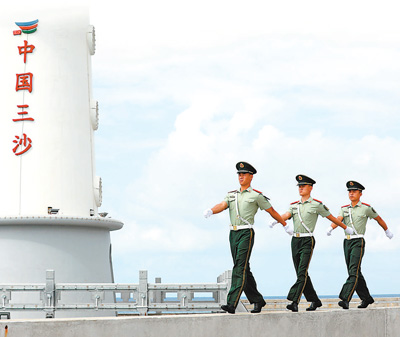 驻守三沙永兴岛的武警官兵在码头巡逻。雷 辙摄(人民视觉)