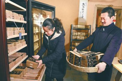 2019年春节期间,蒋维明和妻子在映秀镇“茶祥子”制茶坊里放置新制作的大土司黑茶。