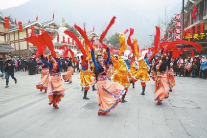 春节期间,汶川县映秀镇群众街头载歌载舞。