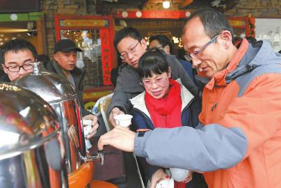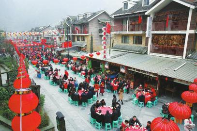 2019年春节,汶川县映秀镇当地群众街头吃坝坝宴。