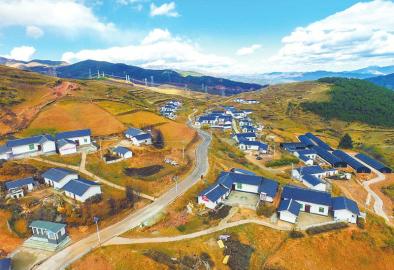 昭觉县火普村村民在阳光下跳起达体舞。他们的身后是新建的安置点,身旁是产业大棚。