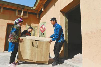 2019年春节前,昭觉县三河村村民吉好也求(右)和家人将家具搬入新房,为乔迁做准备。