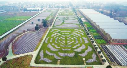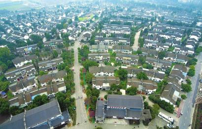 俯瞰成都市郫都区唐昌镇战旗村,“妈妈农庄”与一排排错落有致的川西民居相互辉映。