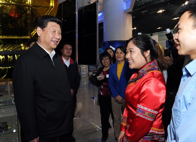 2013年5月4日,习近平和在中国空间技术研究院展厅参观的各界优秀青年代表交谈。来源:新华社