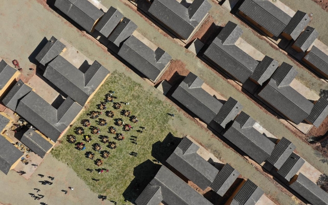 2019年2月11日,在昭觉县三河村的易地扶贫安置点,彝族群众围坐在一起吃起坝坝宴,热热闹闹地庆祝乔迁之喜。来源:新华网