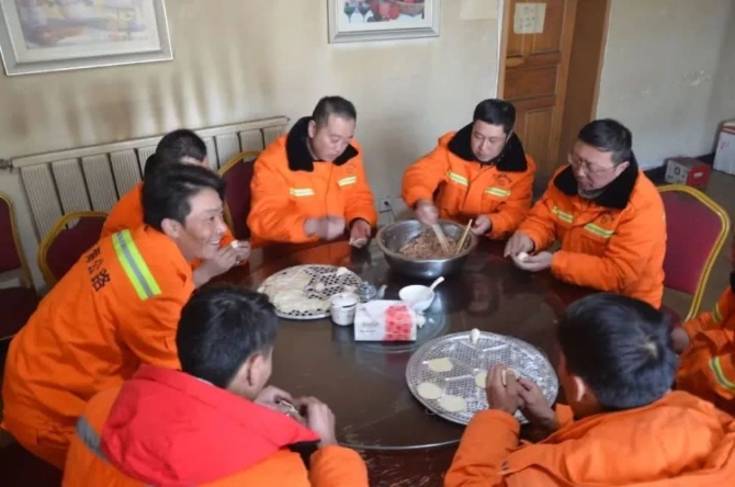 我们20多人的保通队伍在零下30摄氏度的冰天雪地里边走边清雪。风雪中,我们的队伍一点点地向前推进。晚上8点,我们结束了最后一段姜路岭的清雪任务,回到温泉保通点。大家高兴地围坐在一起包饺子、看春晚。为了让我们吃上一顿丰盛的年夜饭,段上从西宁采购了新鲜的食材,食堂大厨专门做了红烧鱼、炖羊肉、四喜丸子、八宝饭等满满一桌子菜肴,很有家的味道。