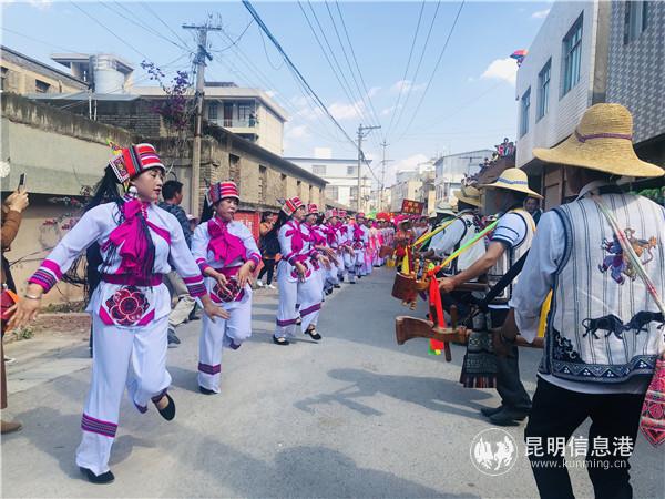在阵阵敲锣打鼓声中,舞龙、踩高跷、舞狮等传统民俗表演走上街头,这是由45支文艺队进行的“踩街”活动。六十岁的陈奶奶带着小孙女坐在街道旁的斜坡上津津有味地看着表演,陈奶奶说到,“每年这个时候一定会来参加‘大香会’,因为这是一个聚集喜庆的日子。”约两公里的“踩街”活动历时逾一小时,最终将大香迎至古城戏台的两侧竖立,在蓝天白云的映衬下,色彩尤为鲜亮。