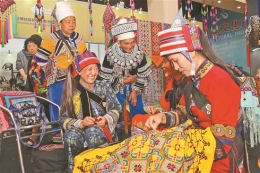 在当地,女子出嫁时,定要穿一整套山地白族服饰,还要带着自己绣的衣服、围裙、绣花鞋、包包、鞋垫作为嫁妆。嫁妆一般要20套服饰,放在箱子里,让人背着,队伍长长的很是壮观。字勤飞出嫁时,光是绣花鞋都装了满满几箱,去到婆家,就把自己绣好的绣花鞋拿出来分发给婆家的亲戚,是这个女子心灵手巧的最好证明。很多年来,关坪的山地白族聚居区都保持着这个传统,妇女们不仅为自己绣嫁妆,也帮别人绣。来请字勤飞绣整套嫁妆的人可有不少,她除了刺绣,连身上的小绒球都可以用手编制。“2000年时,我带着自己绣好的围裙去三月街非遗展演,卖出60元一张,现在,一张围裙拿到关坪赶集时出售,已经可以卖到1000元一张,别人来订做的嫁妆整套可以卖到3000元,更有不少人找到家里来购买”,说到这些,字勤飞脸上充满了对自己手艺的自豪。