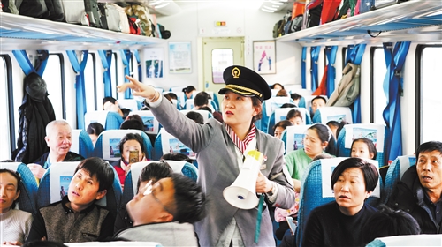 2月8日,北京开往东营南的K1785次列车上,列车长高琳(中)在为旅客服务。经济日报-中国经济网 记者翟天雪/摄