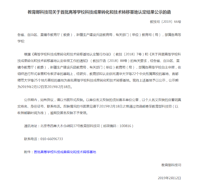 2018年5月,教育部印发了《高等学校科技成果转化和技术转移基地认定暂行办法》的通知,确定了高等学校科技成果转化和技术转移基地认定的指导思想、发展目标、认定条件、认定程序、组织实施。