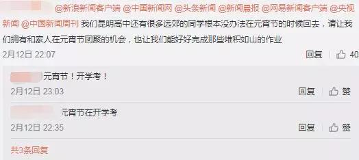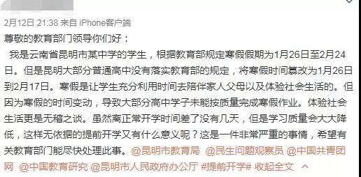 针对网友提出的“学校是否存在提前开学”的疑问,2月13日上午,昆明市教育局、昆明12345市长热线也分别在官方微博上发布了回应: