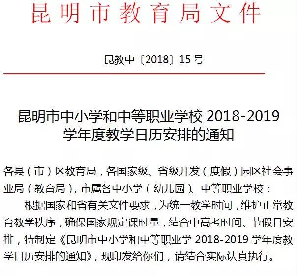 记者查找了昆明市教育局于2018年10月31日印发的《昆明市中小学和中等职业学校2018-2019学年度教学日历安排的通知》(昆教中〔2018〕15号),其中规定,昆明市中学初三年级及高一至高三年级正式开课时间为2019年2月18日(周一,农历正月十四)。