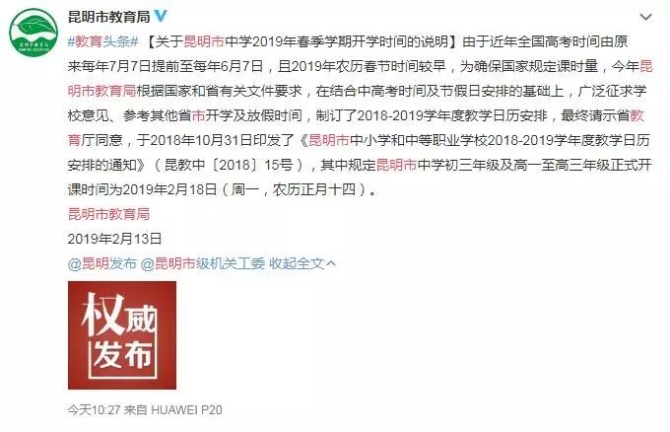 昆明市教育局表示,2019年春季学期开学时间发布之前,广泛征求了学校意见、进行了反复论证,同时参考了其他省市开学及放假时间,并专门请示了云南省教育厅。整个过程依据充分,出台程序合法合规。