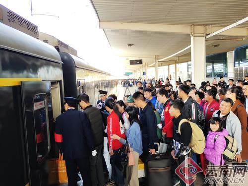 当天下午,在车站工作人员的引导下,1300多名农民工怀揣脱贫致富的梦想,分批登上了昆明开往沪宁杭等地的列车,开启了新一年的致富之旅。 (云南网 记者胡晓蓉)