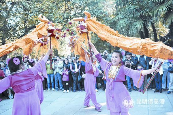 金殿庙会已有400多年历史,是昆明家喻户晓的春节传统民俗节日。昨日上午10点不到,金殿景区已经热闹非凡,太和宫广场、钟楼舞台挤满了游客,摸福、挂福包、赏花、品美食等活动,十分受青睐;主游路两旁摆满了各种昆明特色小吃及手工艺品,糖人、冰糖葫芦、棉花糖、面人,让人感受到了老昆明的年味;舞龙舞狮、划旱船、传统花灯剧等传统民俗表演,也成为此次庙会的亮点之一。