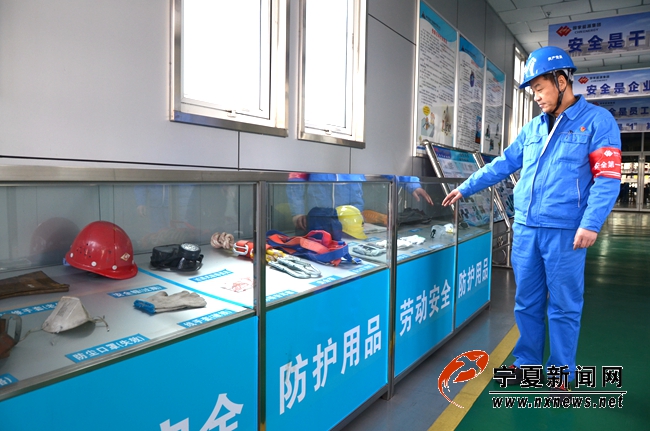 鸳鸯湖电厂维护部党支部书记、副主任张利向记者介绍安全防护用品。
