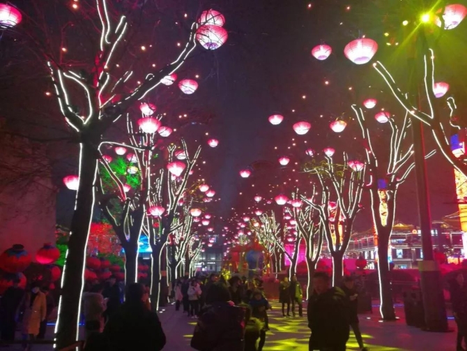 看完表演,从最南边进入街区,8根美轮美奂的LED灯柱营造出浓厚的唐文化氛围,两边人行道树星光闪闪,100多盏扇形灯整齐排列在街道上,每个扇形灯都加有数个可动的射灯投射在地面上,五颜六色的标语和变换的图案铺设出一段花路。