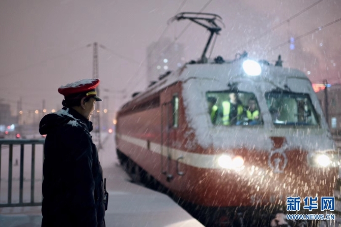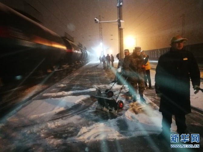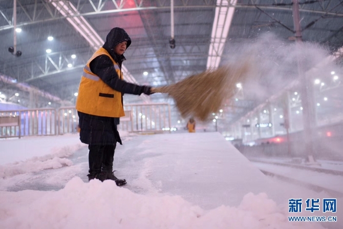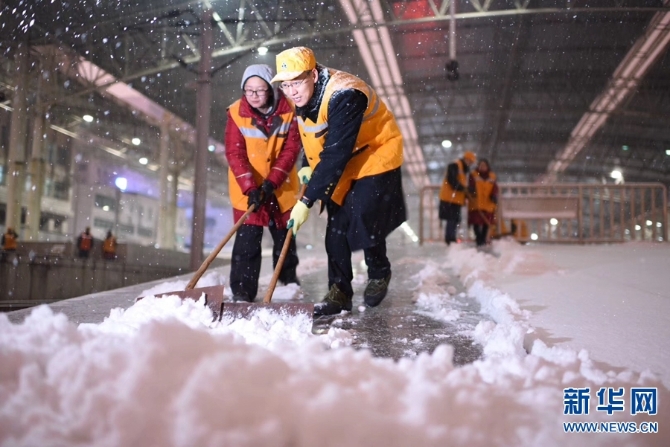 2月13日,河南普降大雪,中国铁路郑州局集团有限公司职工以雪为令,迅速行动,连夜组织在岗和休班职工进行清扫车站站台、股道道岔积雪,确保春运期间交通大动脉安全畅通,让旅客走得了、走得好。