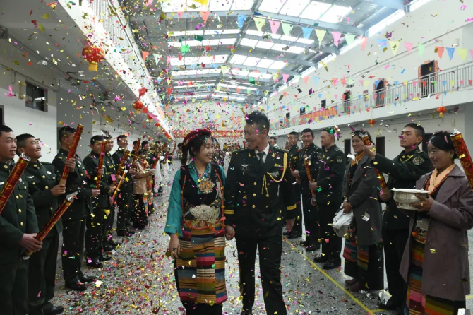 春节和藏历新年期间,家家户户团团圆圆,凛冽的寒风依旧肆虐,屋里却是暖意浓浓。在当地群众和战友们的帮助下,小两口在新年的钟声敲响前,完成了婚礼。婚礼结束后,驻地群众与官兵一起欢度佳节。“军爱民呀民拥军,军民情谊比海深,比海深,星夜等候洒银光,军民谱写新篇章……”在西藏岗巴,驻岗部队对人民的感情就犹如歌曲《军民鱼水情》中唱的那样。驻岗部队官兵正用实际行动诠释双拥花盛开,鱼水情愈浓的和谐篇章。