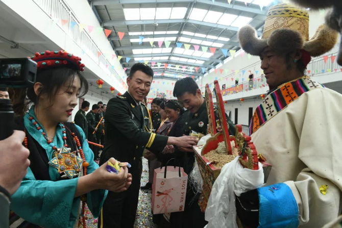 驻地群众手捧吉祥的切玛盒,端着青稞酒给岗巴营这对新人送上诚挚的祝福。吉祥的切玛盒里装着青稞、糌粑等,插上五彩麦穗和罗萨美朵,象征着来年风调雨顺、五谷丰登、吉祥如意。该营下士王哲连续几年都是和驻地群众过年。他说:“藏历新年和农历春节,虽然因工作原因不能回家,但和藏族群众在一起,就像回到家里一样。”