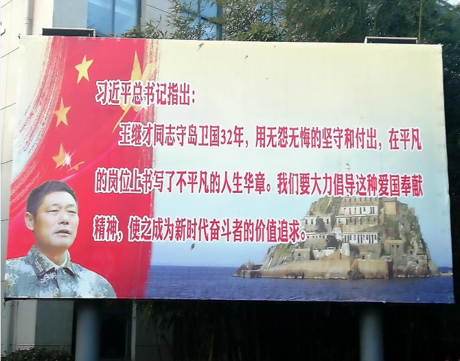 开山岛位于灌云县的黄海前哨,王继才夫妇自1986年7月15日起守护此岛长达32年,直至2018年7月27日王继才突发疾病去世。灌云县的大街小巷随处可见王继才守岛的巨幅照片。“他是咱灌云人的骄傲!”在这座百万人口的县城里,连招待所门口的保安也能随口讲出几段王继才的故事。