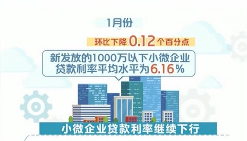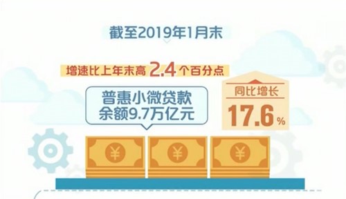 统计显示,截至2019年1月末,普惠小微贷款余额9.7万亿元,同比增长17.6%,增速比上年末高2.4个百分点;一月份增加2109亿元,增量是上年同期的2.6倍;同时,小微企业贷款利率继续下行,1月份,新发放的1000万以下小微企业贷款利率平价水平为6.16%,环比下降0.12个百分点。