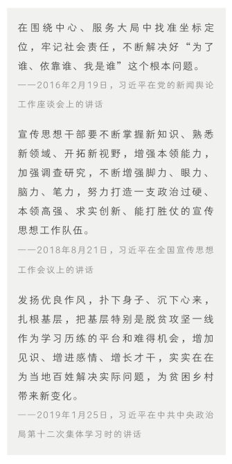 2016年2月19日,习近平总书记到人民日报社、新华社、中央电视台等3家中央新闻单位进行实地调研,随后主持召开党的新闻舆论工作座谈会。在座谈会上,习近平用48字概括了党的新闻舆论工作的职责和使命:高举旗帜、引领导向,围绕中心、服务大局,团结人民、鼓舞士气,成风化人、凝心聚力,澄清谬误、明辨是非,联接中外、沟通世界。