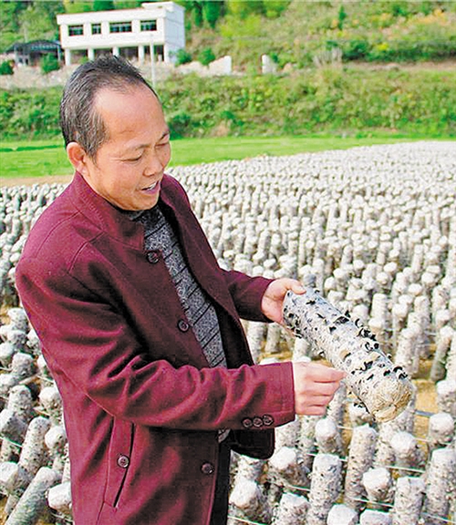 中华山村村委会主任毛照新查看菌棒长势情况。经济日报-中国经济网 记者王新伟/摄