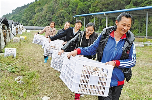 在产业园区打工的村民搬运香菇。经济日报-中国经济网 记者王新伟/摄