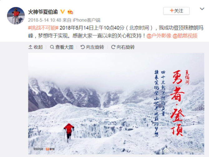 2018年5月14日尼泊尔时间上午8点26分,北京时间10点40分,经过43年不懈的努力,69岁的夏伯渝先生终于登上了珠峰顶峰。美国福克斯新闻网报道称,来自中国的夏伯渝实现了他毕生的梦想,他说他为这一刻已经准备了43年。鉴于尼泊尔刚刚解除了禁止双腿截肢者攀登这座著名山峰的禁令,这一壮举更加令人激动。