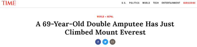 一梦四十年。让我们再把时间线拉回到44年前,据美国《时代》周刊杂志报道,1975年,夏伯渝作为中国登山队的一员,第一次尝试攀登珠穆朗玛峰时,队友在8600米海拔时丢了物资,善良的夏伯渝直接把睡袋让给一旁冻得瑟瑟发抖的藏族向导,返回大本营后,他受伤的脚已经成了黑色,结果双腿被冻坏死后被迫截肢。