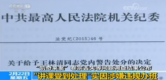 2014年12月,因王林清违规参与营利性活动,依据《人民法院工作人员处分条例》有关规定,最高人民法院监察局决定给予王林清记过处分。2015年4月,依据《中国共产党纪律处分条例》有关规定,最高人民法院机关纪委决定给予王林清党内警告处分。