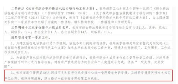 通知还明确了云南省通信管理局12321网络和垃圾信息举报中心统一受理扰电话举报,用户如被电话骚扰,可拨打12321或登陆12321官网举报,举报中心将及时将相关举报情况通报各相关单位,并督导各基础电信企业全面建成网间投诉联动协查机制。针对骚扰事实成立的将予以处置并进行责任追究。对问题严重的主要负责人和具体责任人,要严肃处理,并有案必查,查实必罚。